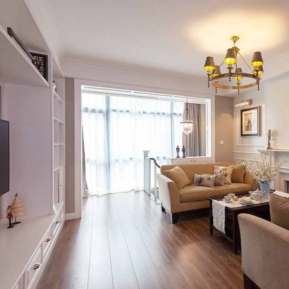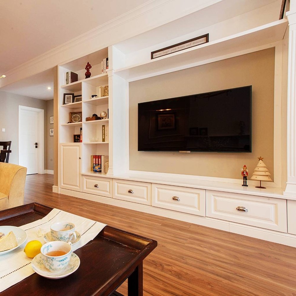 客厅的电视墙布局比较简单实用,墙体设置了置物架和抽屉柜,大大增加了客厅的收纳功能。置物架可以摆放照片或者心爱的小饰品等,而抽屉可以用来收纳一些零碎的物品。米白色的家具与木质地板风格协调,让整体空间氛围不同于传统美式家居环境的严肃深沉,显得更加轻松明快。