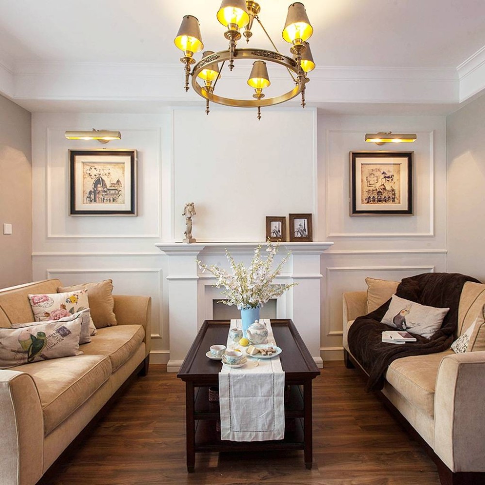 客厅两条沙发面对面摆放,显得舒适自由。背景墙摆脱了传统的装饰形式,而是在中间打造了一个壁炉,壁炉是美式风格的典型元素。一家人围炉夜话,显得格外温馨有情调。背景墙用石膏线划分成不同的版块,点缀两幅装饰画让空间显得更加活泼。