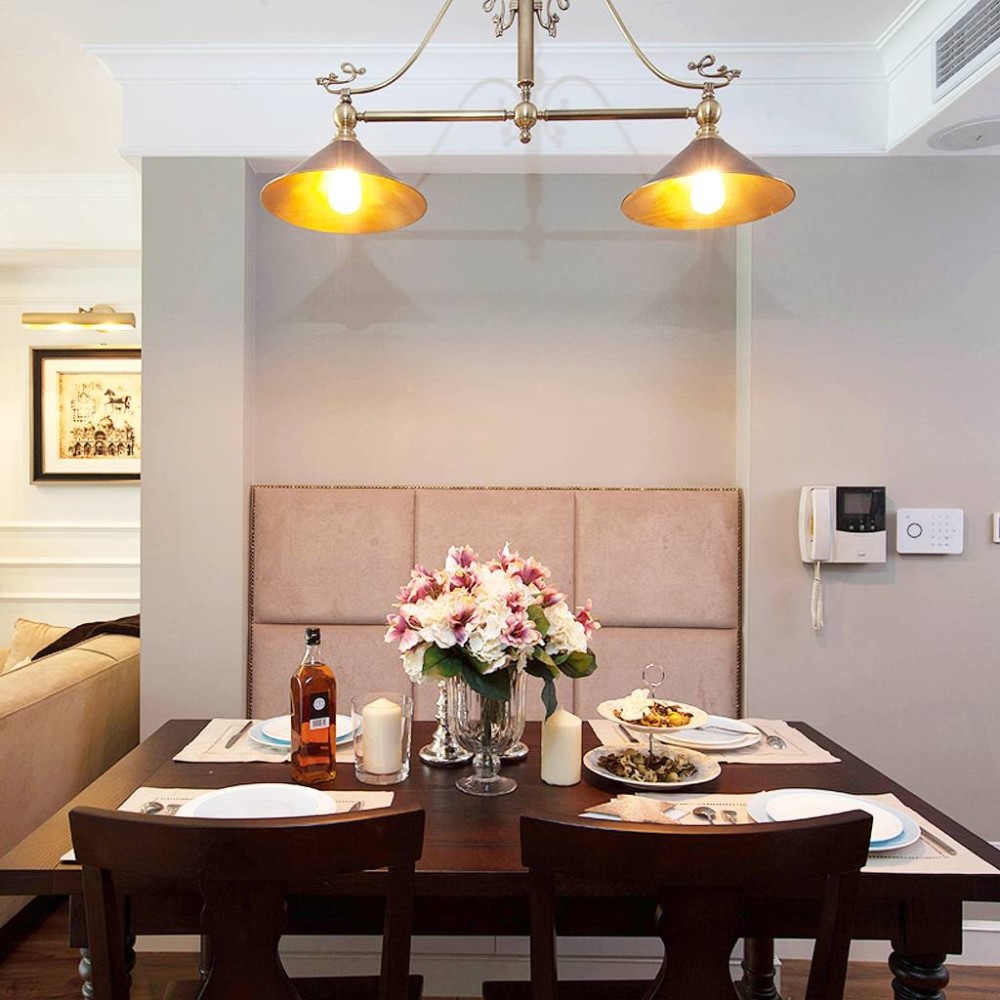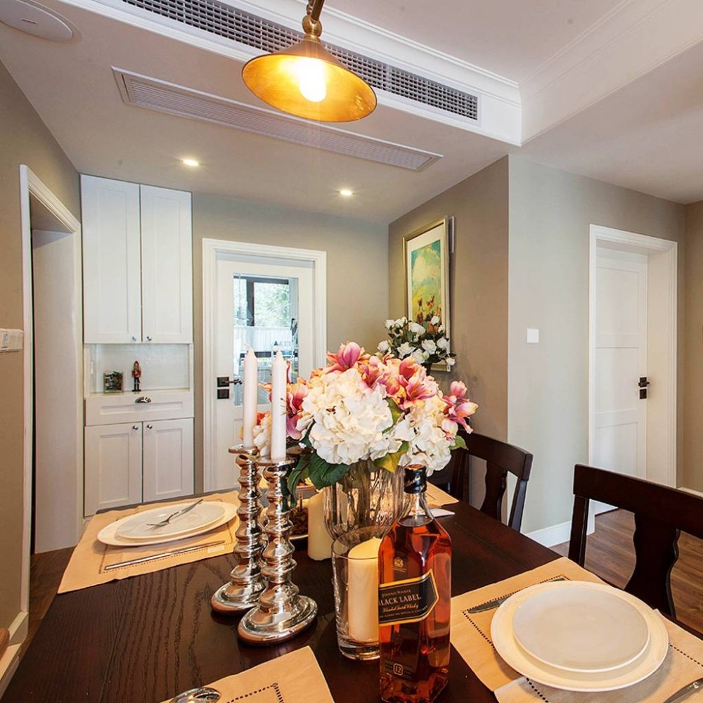 餐厅紧邻客厅,以沙发作为分割。美式装修追求温馨休闲的家庭氛围,而餐厅作为一家人日常用餐之处,在家居设计中更不容忽视。由于餐厅空间较小,所以只能因地制宜,采用卡座形式尽量节约空间。实木餐桌有种厚重的美感,光线柔和的复古吊灯显得温馨而有文艺范儿,在桌上摆一束鲜花,营造浪漫又惬意的用餐氛围。