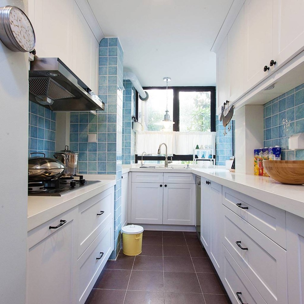厨房格局狭小,因此设计成U型空间,一侧作为准备区,一侧是烹饪区,中间部分是洗涤区。厨房布置了很多抽屉和柜子,保证收纳空间足够,合理存放各类厨房用品,让厨房显得整洁干净不杂乱。厨房墙壁采用蓝色瓷砖,配合米白色的家具,显得干净优雅,整齐大方。而黄色的垃圾桶、深色的地板让空间显得层次分明,活泼明快。