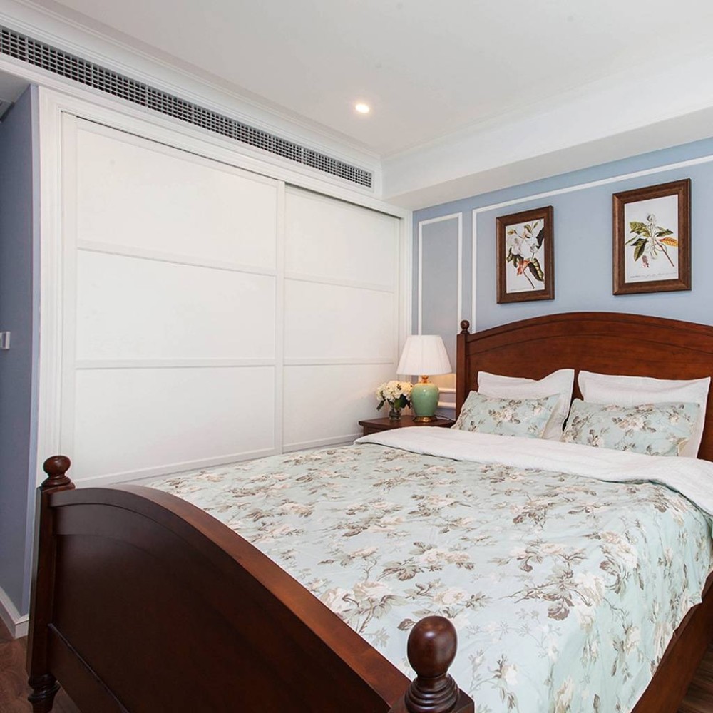 美式家居的卧室布置较为舒适宜人,常用各色布艺作为装饰。这间主卧墙壁粉刷成色调柔和的淡蓝色,衣柜也是浅淡的米白色,让整个卧室显得清新淡雅。衣柜采用推拉门,节约空间。