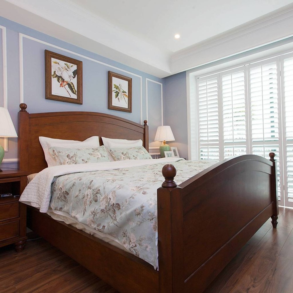 落地百叶门的设计让卧室温馨明亮,通风良好,能够充分沐浴阳光。木质地板,红木大床,田园风格的床品作为装点,再配合墙壁上休闲写意的装饰画,整体给人稳重又舒适的视觉享受。