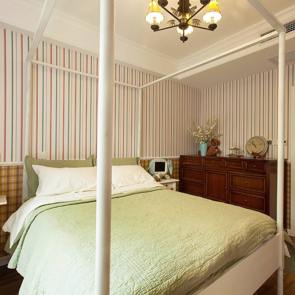 儿童房采用了美式卧室典型的四柱床,米白色的床柱搭配小清新的浅绿色床品,华贵中透着休闲浪漫。夏季还可以装上纱幔,打造一个温馨的私密空间。墙角摆放一个美式的实木柜子用来收纳杂物。柜台摆放一些装饰物让空间更加生动。墙壁上半部分贴了颜色相间的竖纹壁纸,视觉上增加了卧室高度,不会使人感觉压抑;下半部分墙纸是黄色格子状,显得稳重大方。