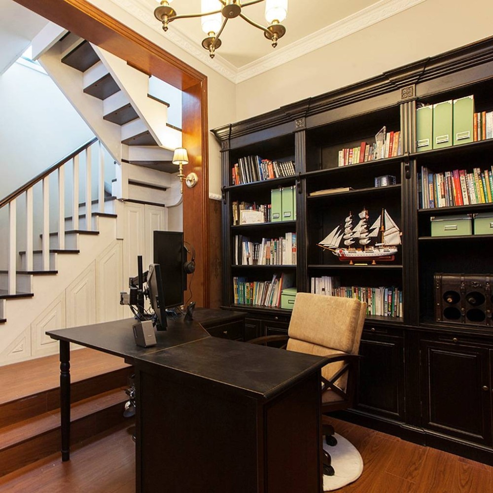 房子附带的地下室被打造成了开放式书房,从楼梯走下来就能看到书房的整个布局。原木色的地板,搭配黑色的书桌、书架,显得古典雅致,营造出静谧的阅读空间,让人能够在书房静静地读书、工作。