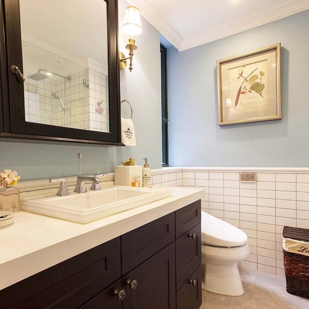 卫生间清新自然,浅蓝色的墙壁显得恬淡柔和,梳妆镜镶嵌的木质边框、深色的收纳柜,以及墙壁上颇具田园气息的装饰画,大大丰富了空间的元素构成,给空间增加一丝灵动。