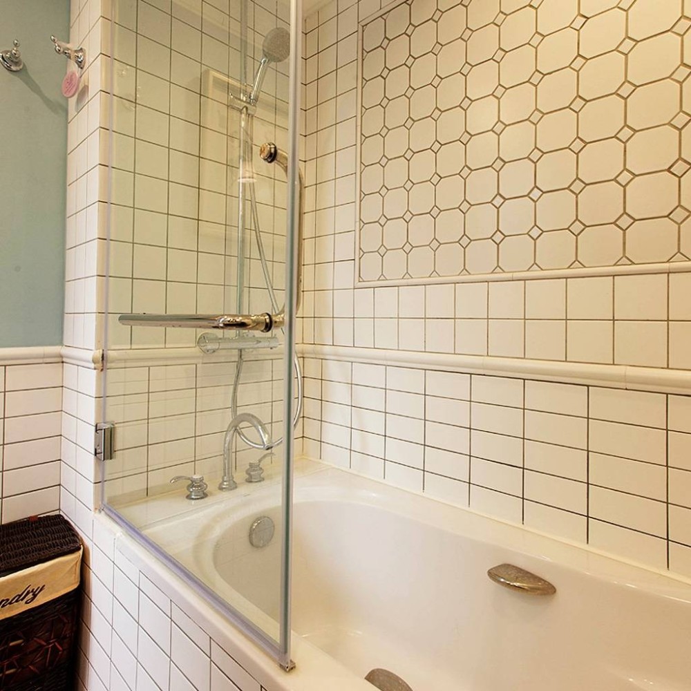 沐浴区设计成浴缸淋浴一体式,用玻璃推拉门做简单的干湿分离。淋浴区墙壁铺设白色瓷砖,不同的瓷砖样式相互配合,让墙壁显得层次丰富分明,美观大方。