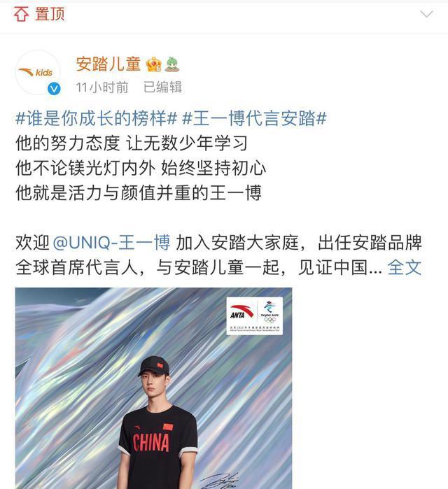 今早官宣之后,安踏儿童火速把新代言人微博置顶了。