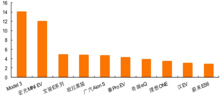 从车型来看,特斯拉与五菱宏光MINI形成高低组合,分列第一、二名,销量均超过10万辆,遥遥领先其他品牌。特斯拉在网联科技、无人驾驶、电池技术等领域一路高歌猛进,以令人目不暇接的态势不断推陈出新,销量节节攀升。五菱宏光MINI EV以超低的价格、灵动的造型设计、远优同价格区间老年代步车的产品力,迅速成为电动汽车行业的“网红”。