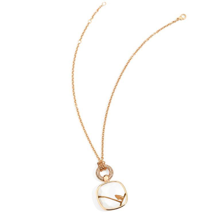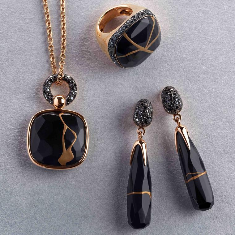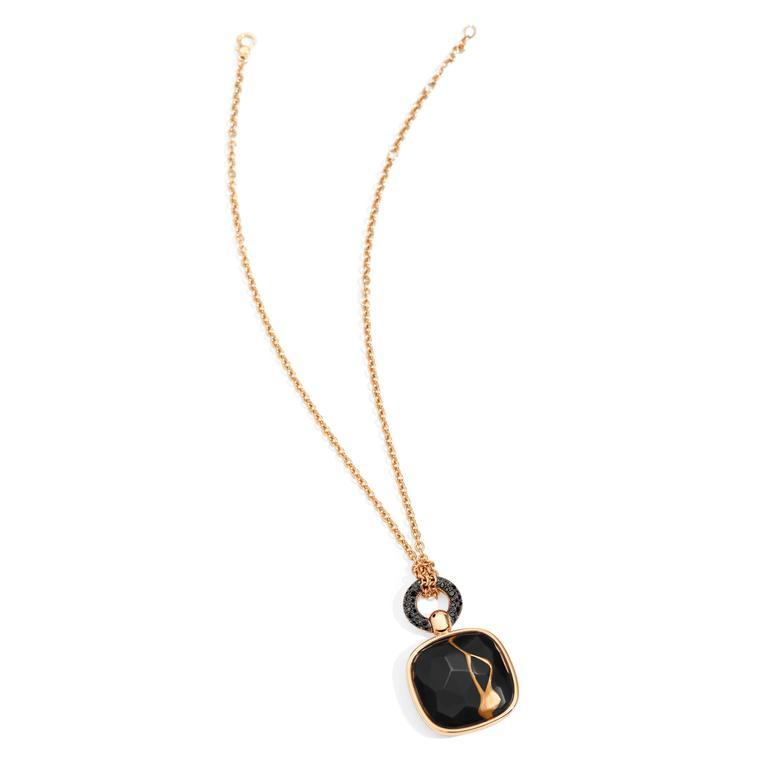 玫瑰金吊坠与喷气式和黑色钻石从波梅拉托金苏吉高珠宝收藏品2021年。这种技术是一个优雅的解决方案,修复日本的C15日本最受欢迎的佐贡Ashikaga Yoshimasa茶碗。
