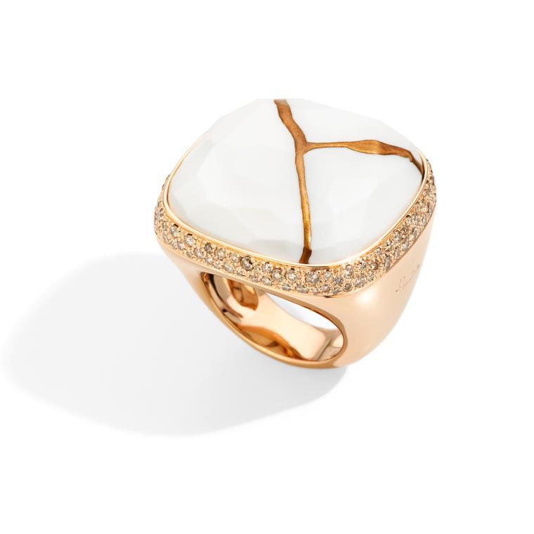 玫瑰金戒指与高龙和棕色钻石从波梅拉托的金苏吉高珠宝胶囊收集2021年。用镰刀修复的物品的价值有了很大的提高,这导致了C16有目的地打破瓷器的做法。
