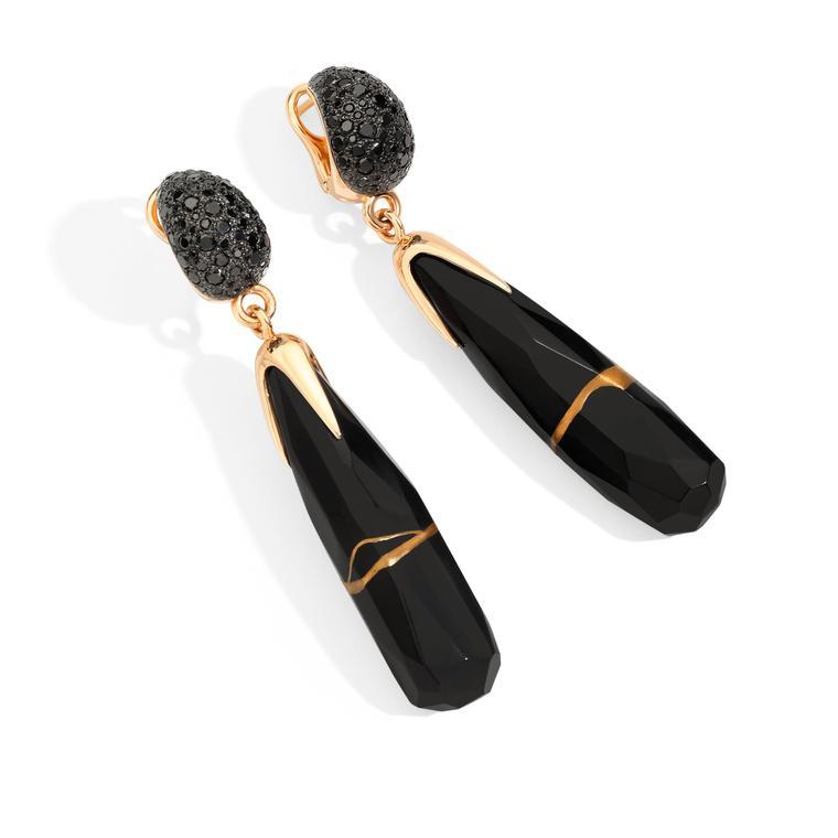 玫瑰金耳环与喷气和黑色钻石金属吉高珠宝收藏2021年波梅拉托。这个名字来源于日本的“亲属”,意思是金子和用来修补的“恙虫病”。