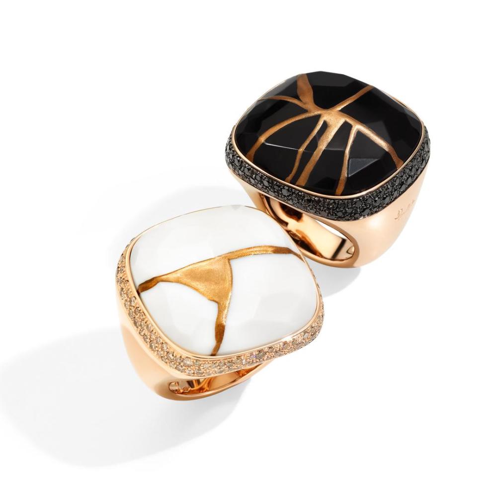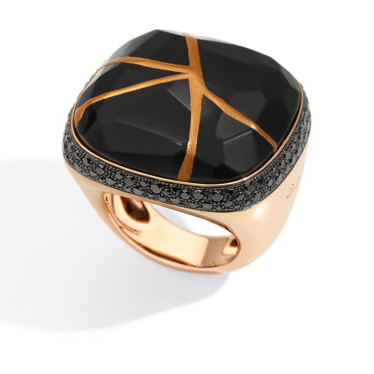 大胆的玫瑰黄金与喷气和黑色钻石戒指从金苏吉高珠宝收藏品2021年由波梅拉托。Pomellato致力于寻找可持续的解决方案,并在对奢侈品的创新态度的推动下,通过使用日本古代的补漆艺术来拥抱缺陷。